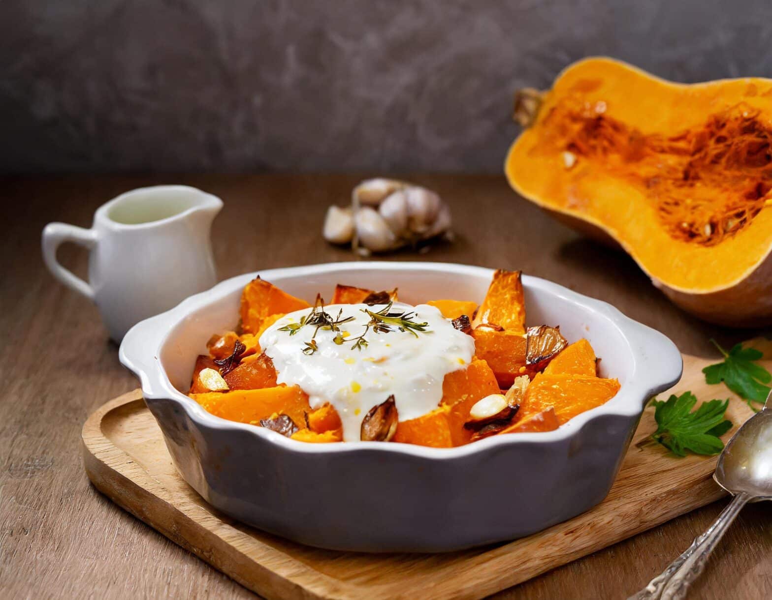 Tasty recipe of red cabbage salad, roasted butternut squash and feta with lemon.