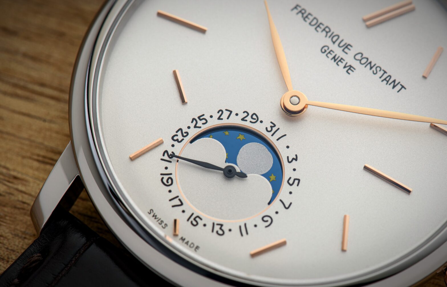 But quickly, its originality and off-beat aesthetic end up winning. The usual classicism of Frederique Constant gives way to more whimsy on its dial, with indices applied randomly and its decorative elements handcrafted: the logo and the date seem to have been written by a child, as well as the moon phase drawing.