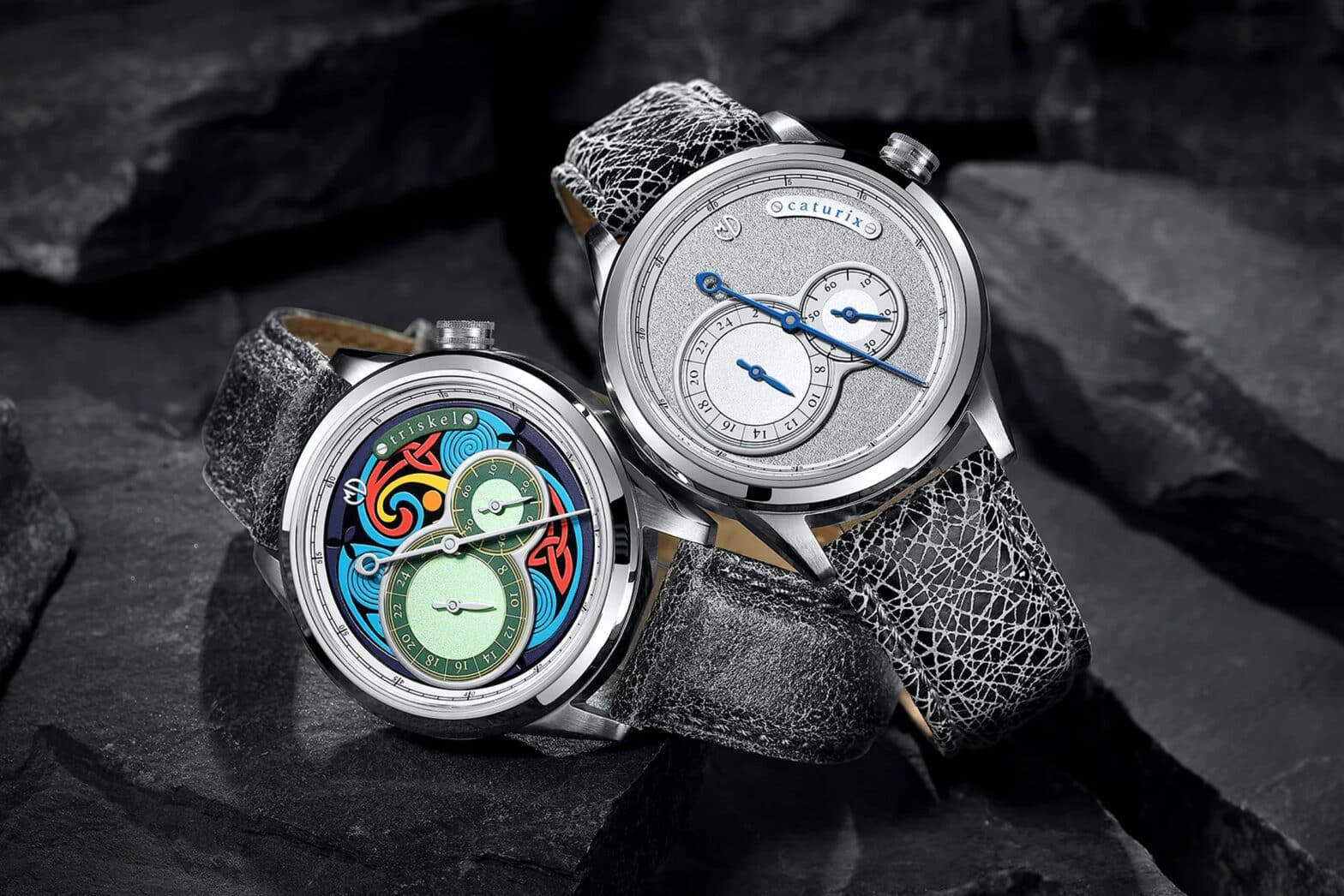 The first, the most sober, is christened Caturix, after the name of the War God (equivalent to Roman Mars or Gallic Toutatis). Its textured silver finish captures and reflects light, “like stars in the sky”. The second, Triskel, features a multicolored dial that revisits the ultimate Celtic symbol, with its three freely redesigned spirals. The success of the Kickstarter campaign should also allow MD Watches Studio to offer new variants of dials in vibrant colors: Alaunus (pink), Ogmios (blue), Taranis and Tonaros (orange).