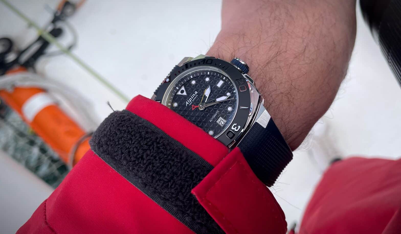 Alpina has indeed chosen to equip it with its iconic Extreme cushion-shaped casing. With its relatively contained dimensions (39 x 40.40 mm for 12.65 mm thick), this toolwatch can fit all wrists, from the strongest to the thinnest, both male and female. Aesthetically, the brand seems to have found the perfect compromise between elegance and sportiness: it’s not hard to imagine wearing this timepiece under a shirt or a suit… even though it’s with a skipper’s waterproof suit that we put it on our wrist.