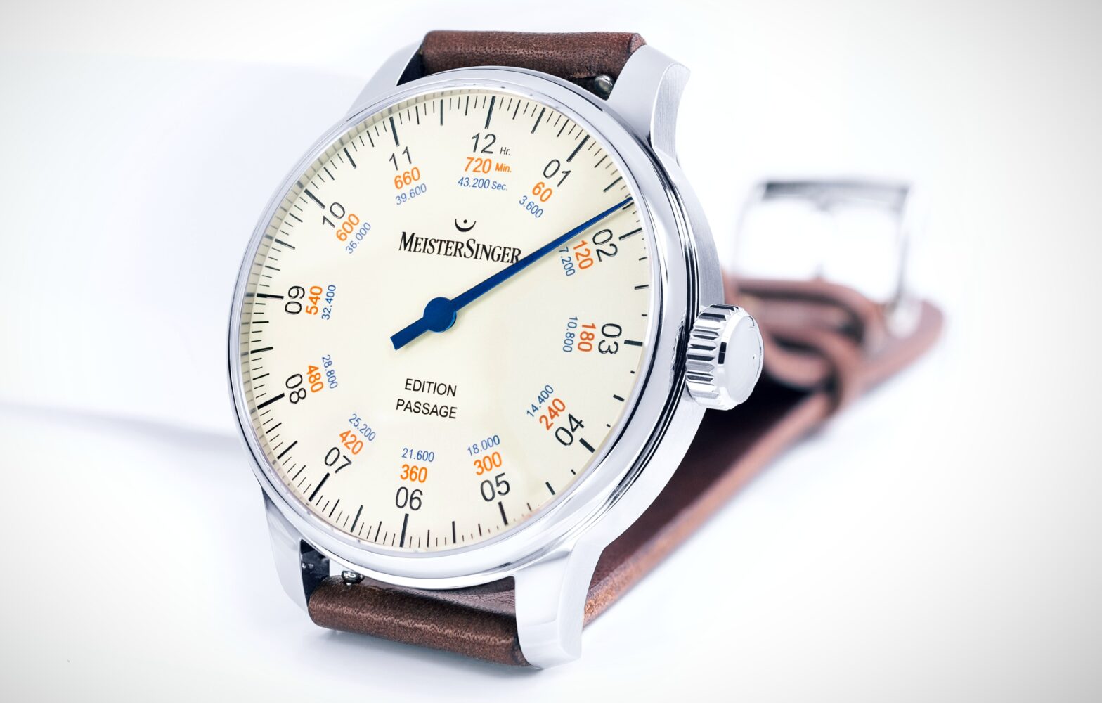 In ivory color, it is crossed by a single unique blue line that moves “with the usual serenity of MeisterSinger”. But this time, it is not satisfied with telling the time within five minutes: in addition to the 12 black indexes, red numbers count the elapsed minutes (from 60 to 720) while blue numbers indicate the seconds (from 3600 to 43,200). So when it is 6 o’clock, you will also know it is 420 minutes or 25,200 seconds. Certainly, this is not very useful in daily life, but MeisterSinger sees it as a way to make us perceive time differently (and that it passes quickly!).